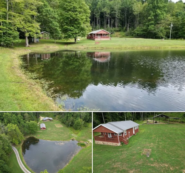 This 11.24-acre property in Cave, West Virginia, offers a peaceful mountain retreat with a spring-fed pond at its center. The pond attracts geese and other wildlife, while the surrounding hills create a serene and private setting.
