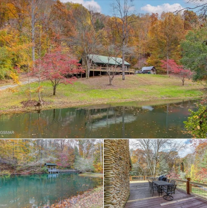 The half-wrap deck includes a hot tub, a dining area, and a covered swing space that overlooks the pond and surrounding woods. Moreover, the water reflects the trees throughout the day, which creates a calming backdrop for outdoor relaxation. Also, a cozy guest cottage sits across the parking area and features vintage log construction, a king bed, a breakfast space, and a bath with a clawfoot soaking tub. In addition, a short walk around the pond leads to a footbridge and gazebo positioned for quiet moments in nature. Because of this, the property supports year-round outdoor enjoyment.