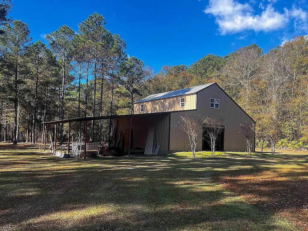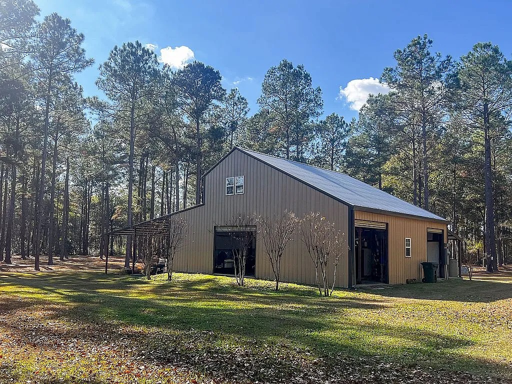 A large 40×36-foot two-story metal building includes electricity and serves as a versatile hub for work and recreation. The first floor features four oversized roll-up doors, ample lighting, and multiple outlets—perfect for vehicles, equipment, or hobby projects. An exterior 30-amp RV hookup adds convenience and flexibility.
