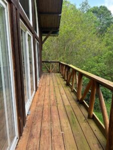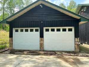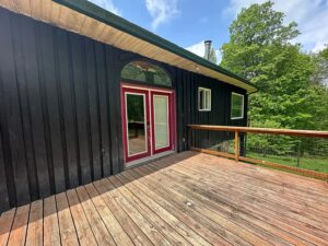The main level includes an open-concept living area, a full kitchen, and a spacious primary bedroom with a private bathroom. Custom woodwork adds a rustic charm to the interior, contributing to a warm and inviting atmosphere.