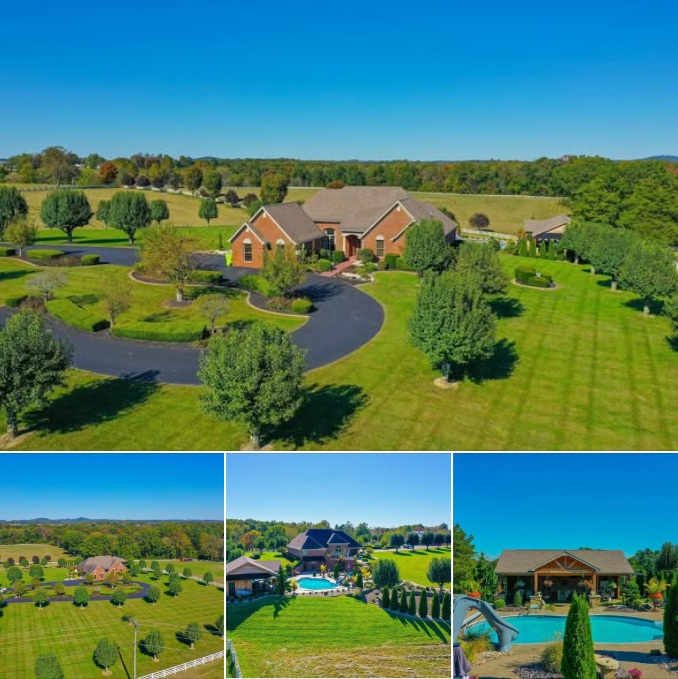 This London, Kentucky property combines a large brick home, geothermal efficiency, fenced acreage, multiple barns and garages, and recreational amenities across nearly 27 acres. The mix of residential comfort and functional infrastructure supports equestrian use, homesteading, business activity, or private estate living.