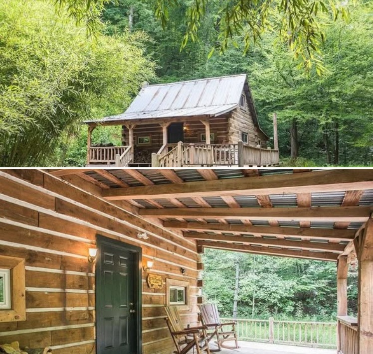 The setting is one of the property’s strongest features. A gated entrance leads down a level, tree-lined road to the cabin, creating a sense of privacy from the start. The home sits beside a spring-fed pond that flows year-round, adding both visual appeal and a calming atmosphere. From the covered front porch, you can hear the water and watch local wildlife, including deer, wild turkeys, and birds that frequent the area.