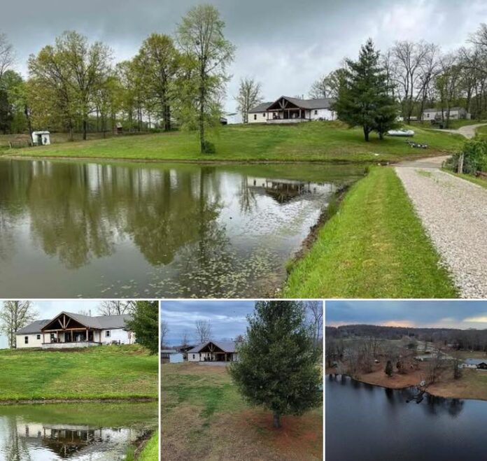 The property includes two metal buildings. One building, measuring 50×52 feet, is partially finished with heating, plumbing, a 12×48 front porch, and a covered back porch. Both porches overlook a 10-acre stocked lake, creating a scenic outdoor setting.