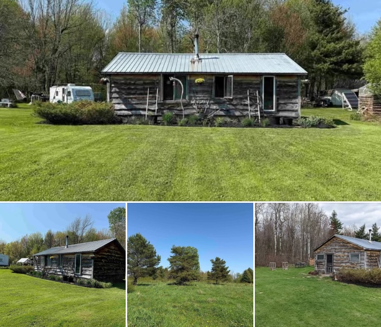 • Main Cabin (20’ x 32’): Open-concept layout with three bedrooms, wood/cookstove heating setup (stove not included), drilled well producing 11 GPM, and an outhouse for rustic, off-grid living.