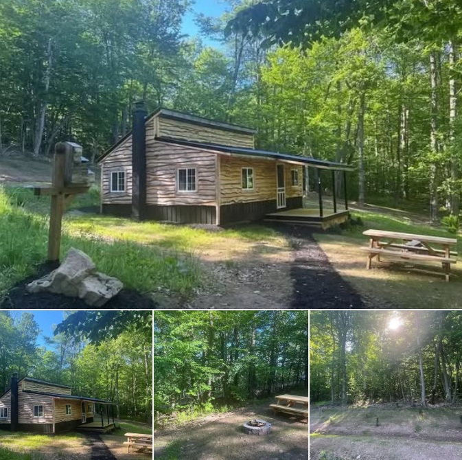 Inside, the cabin features an open floor plan with a well-appointed kitchen complete with a butcher block countertop and a full bathroom. The living area is flexible, allowing you to create a comfortable space for relaxing, entertaining, or sleeping. The cabin is wired for a generator, which is included, and the plumbing is ready for easy customization, making it an ideal option for those seeking a partially off-grid lifestyle.