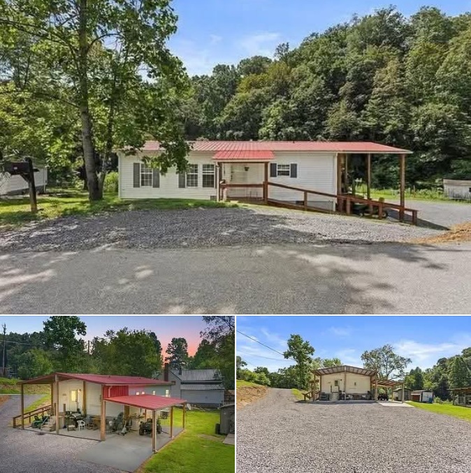 Recent upgrades include a new metal roof, freshly built decks, and a carport area with a ramp leading to the front door. The driveway has also been freshly graveled for easy access.