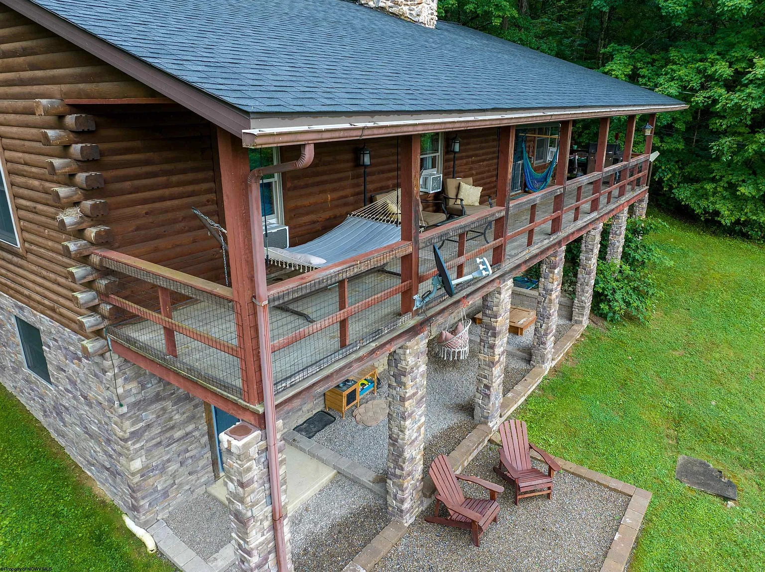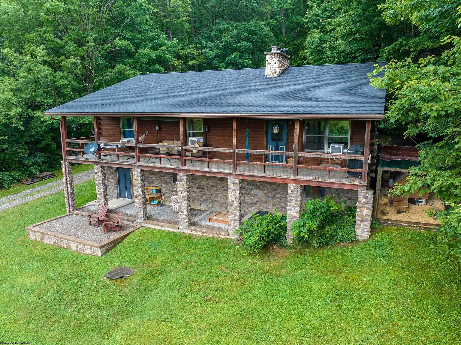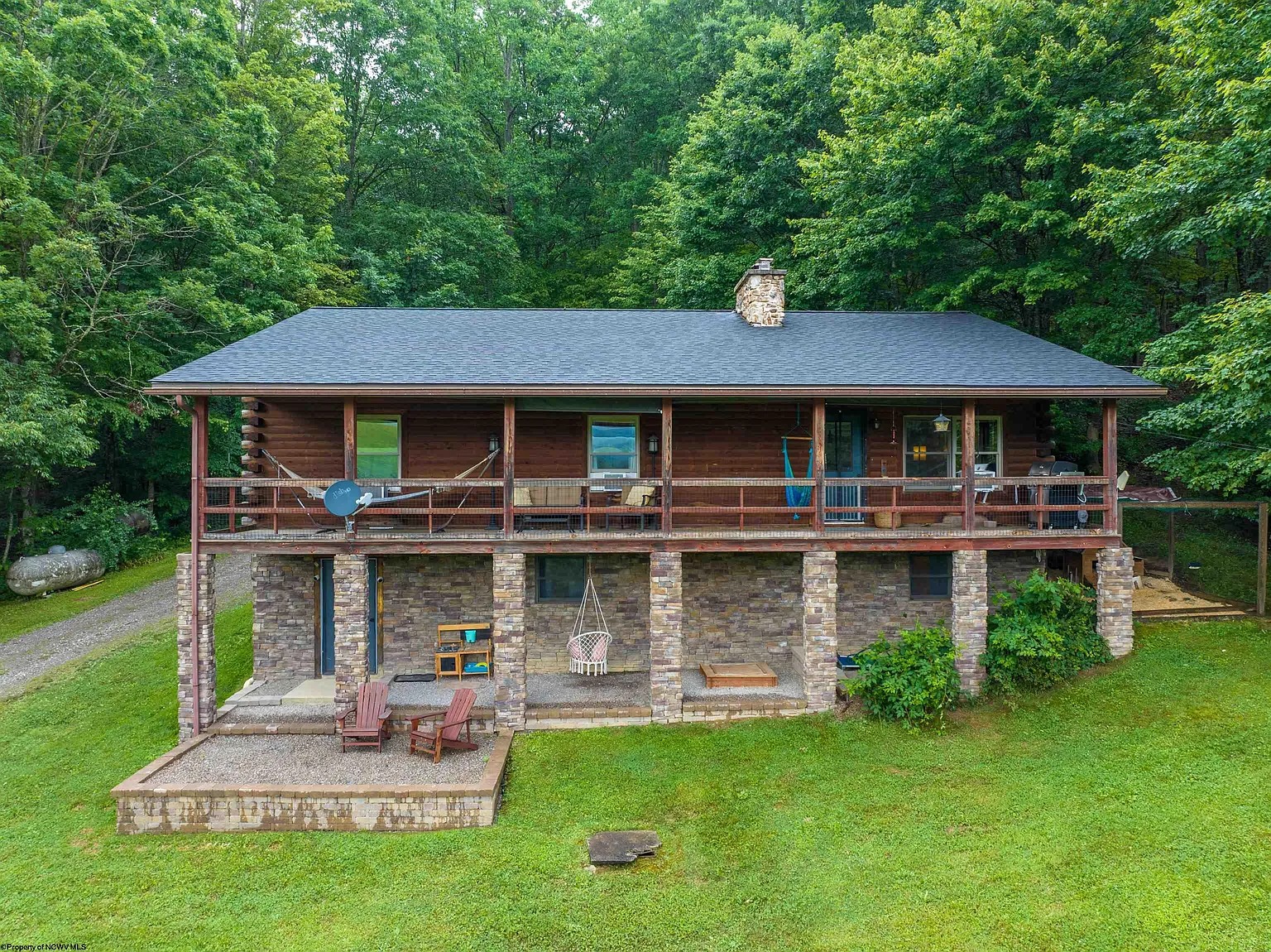 Inside, the home is filled with warm, inviting details that reflect true log-cabin living. The wood-burning fireplace and pellet stove create a cozy atmosphere during the colder months, while propane baseboard heating provides reliable backup warmth. The kitchen blends rustic charm with practicality, featuring modern appliances, ample cabinetry, a large central island, and a dedicated dining area for family meals.