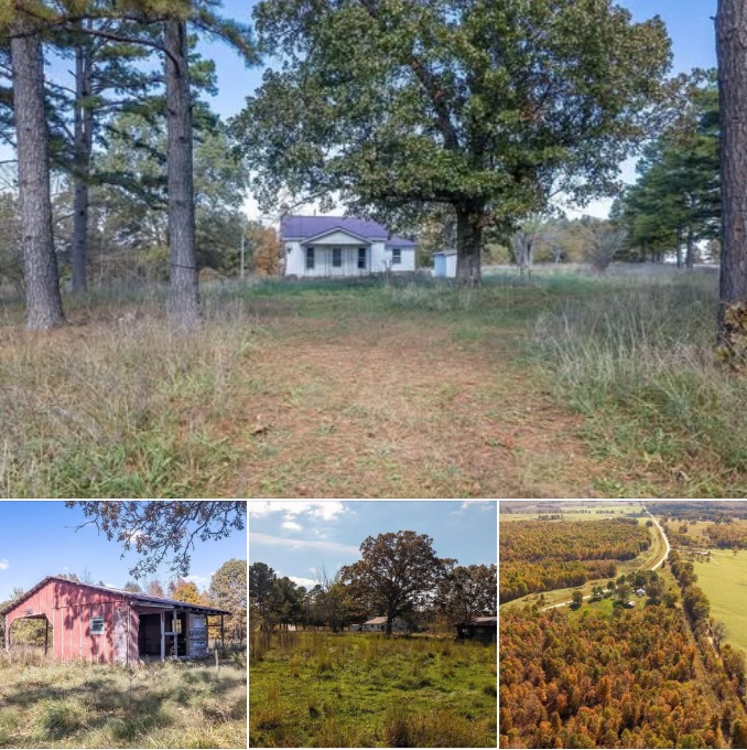 The two-bedroom, one-bath home, built in 1950, offers approximately 1,208 square feet and is well-suited for renovation. A metal roof adds durability, while the interior layout allows flexibility for updates and customization. The shaded yard includes mature pine trees that enhance privacy and outdoor comfort. Two storage sheds provide space for tools, equipment, or seasonal storage, making the home a solid starting point for a farmhouse renovation or weekend residence.