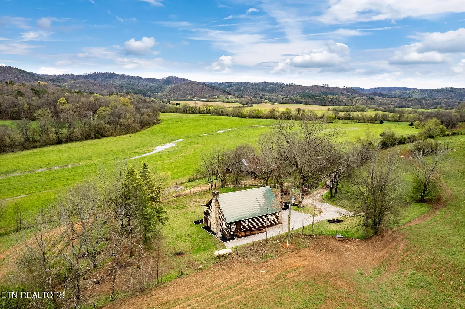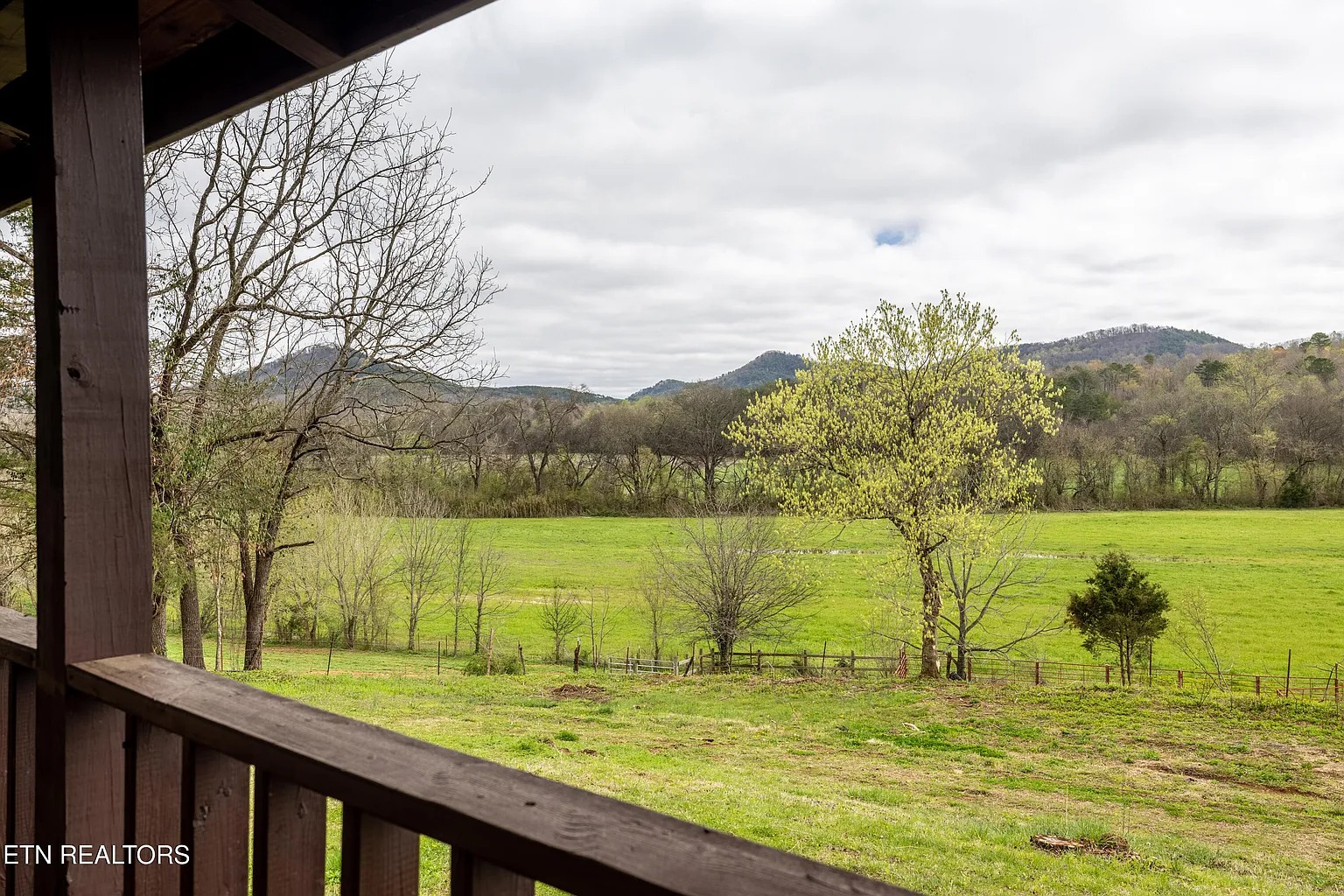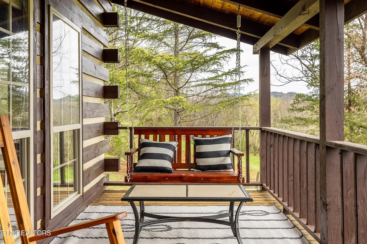 At the heart of the property sits a 1,456 sq. ft. log cabin, built in 2000 on the original family homesite. The cabin includes 3 bedrooms, 2 bathrooms, and a cozy wood-burning fireplace that anchors the warm, rustic interior. A full-length covered porch lined with rocking chairs and a swing invites you to relax and take in the peaceful mountain scenery.