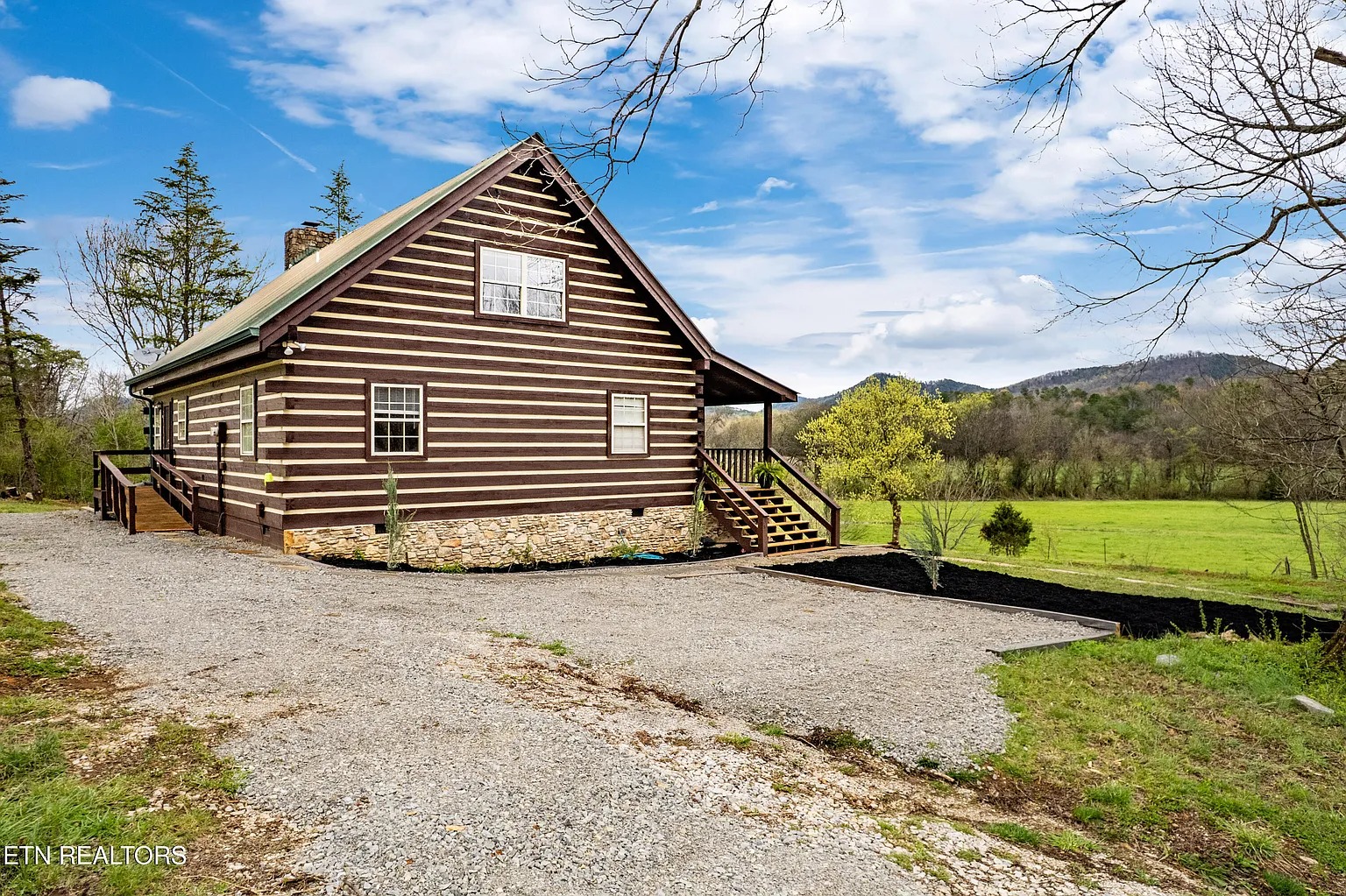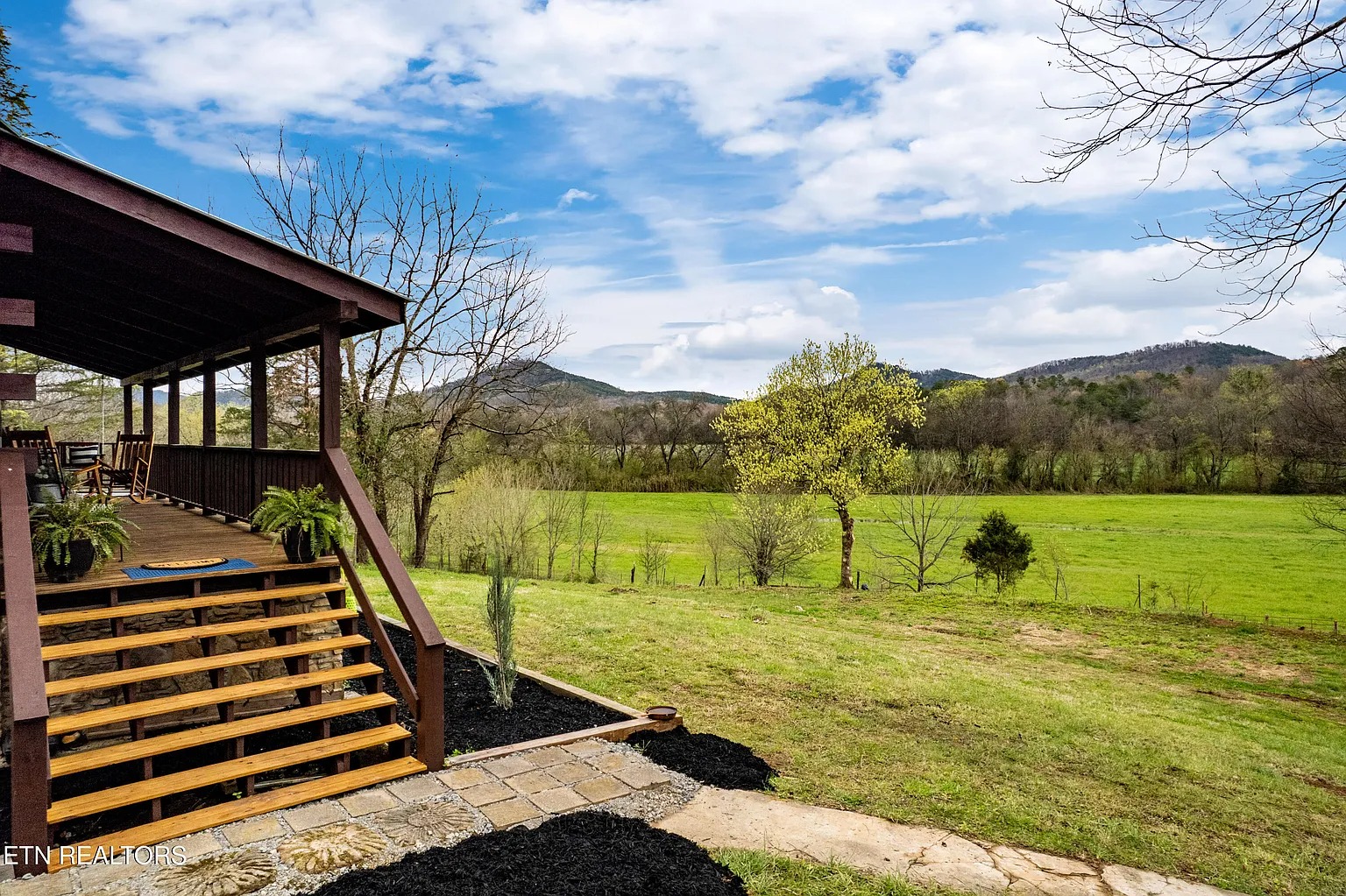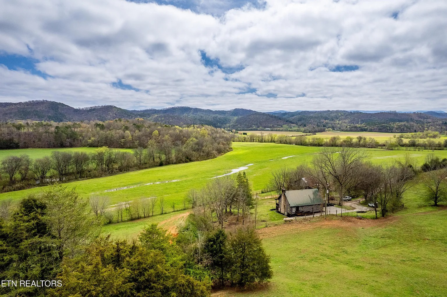 At the heart of the property sits a 1,456 sq. ft. log cabin, built in 2000 on the original family homesite. The cabin includes 3 bedrooms, 2 bathrooms, and a cozy wood-burning fireplace that anchors the warm, rustic interior. A full-length covered porch lined with rocking chairs and a swing invites you to relax and take in the peaceful mountain scenery.
