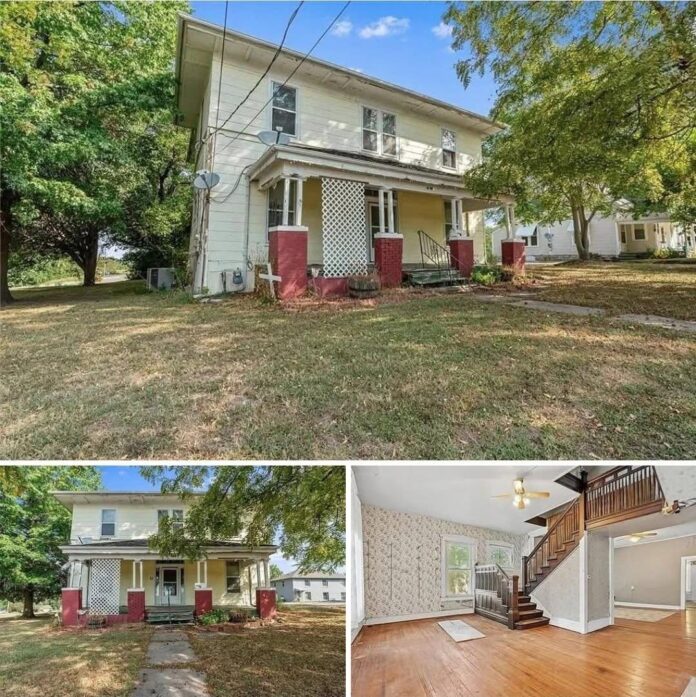 The home features a traditional two-story layout with large rooms and tall ceilings consistent with older construction styles. While updates and repairs are necessary, the building provides a structural base for restoration or repurposing.