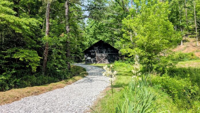 This century-old oak-and-cedar cabin sits about 700 feet off a low-traffic country road, offering a balance of privacy and accessibility. Surrounded by sweeping mountain views, the cabin provides a tranquil retreat while remaining within reasonable driving distance of nearby towns for shopping, dining, and everyday services.