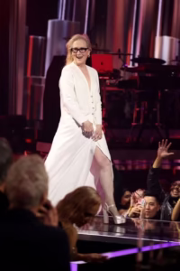 Fast forward to the 2024 iHeartRadio Music Awards, and Meryl once again captivated audiences, not just with her talent but with her style and heart. Dressed in a stunning white Lanvin gown, she exuded sophistication. The gown featured a daring thigh-high slit, perfectly paired with sky-high heels — a bold statement that highlighted her poise and confidence. At every step, she proved age is no barrier to elegance.