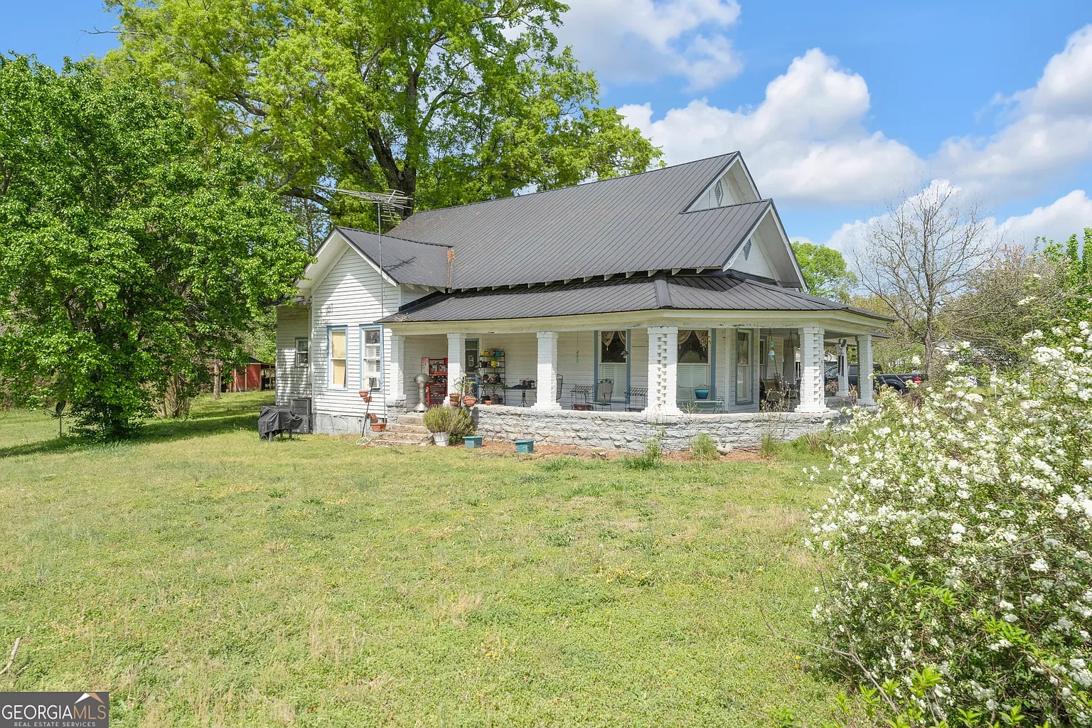 A large storage barn and carport stand on the property and support daily utility. These structures offer room for tools, equipment, and vehicles. Because of their placement, they keep work areas separate from living space. Owners may convert storage areas into workshops or hobby zones. Additionally, the metal roof on the main home adds durability and reduces long-term maintenance concerns. Practical features like these support renovation projects and ongoing land use.