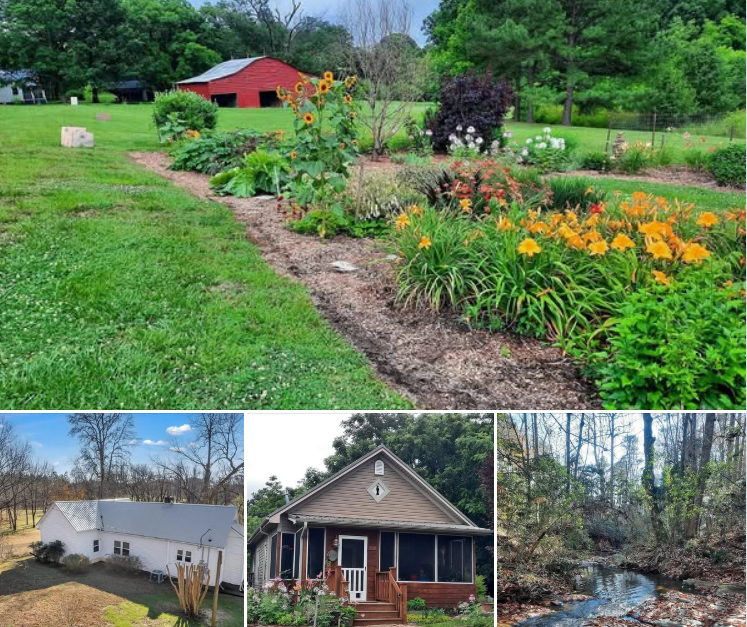 This 30.86-acre property in Lawndale, North Carolina, includes two separate homes and a stream running through the land. The first home, built in 1900, offers approximately 1,436 square feet of living space with 3 bedrooms, 1 bathroom, pine floors, a large eat-in kitchen, and a living room with a fireplace. The home has a metal roof.